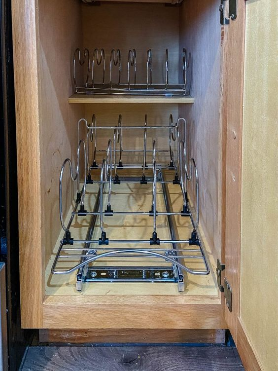 A tower rack is an effective way to store pot lids separately. Install a tower rack in your cabinet to keep lids neatly organized and within easy reach. This approach helps prevent clutter and ensures that you can quickly find the lid you need.