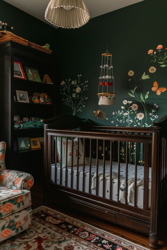 A dark forest nursery offers a moodier take on the enchanted forest theme. This design features deeper hues and shadowy elements, creating a dramatic and immersive atmosphere. The use of darker tones and forest imagery evokes a sense of depth and mystery, providing a unique and captivating environment for your child’s room.
