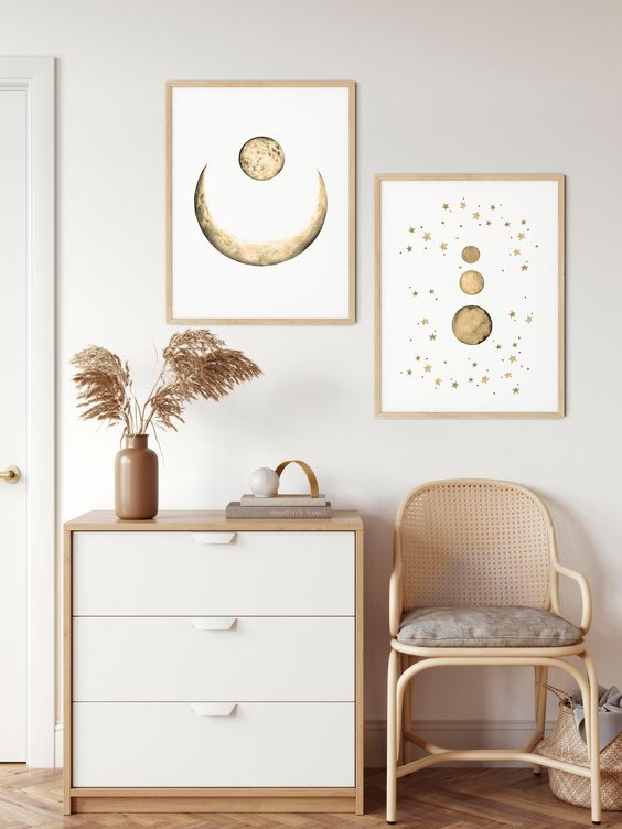 Moon phase wall decor adds a touch of elegance and mystique to a celestial bedroom. This decorative element captures the changing phases of the moon, adding a dynamic and intriguing visual aspect to the room. Its sophisticated design enhances the overall theme, contributing to a magical and enchanting atmosphere. Incorporate moon phase wall decor to achieve a perfect balance of elegance and celestial charm.