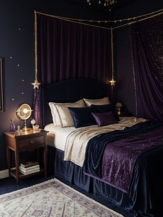 A dark purple bedroom exudes a luxurious and mystical aura, perfect for a celestial theme. This rich hue adds depth and intrigue to the space, creating a dramatic and elegant atmosphere. The dark purple color scheme enhances the room’s overall sophistication and aligns beautifully with celestial elements. This theme promises to captivate and impress with its enchanting and regal appeal.