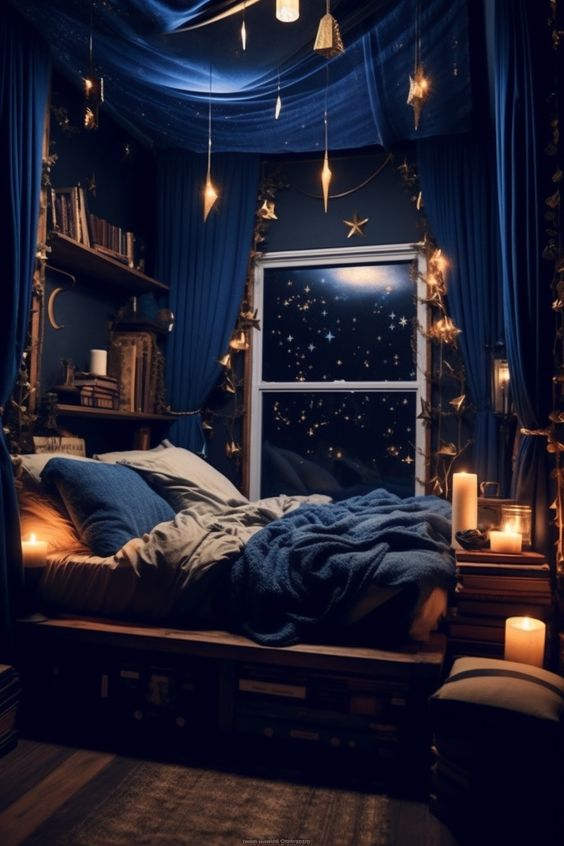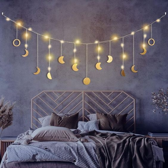 Draped lights overhead are a fantastic way to create a celestial atmosphere in your bedroom. These lights, positioned with care, provide a soft and enchanting illumination that enhances the room’s aesthetic. The draped effect adds a layer of sophistication, helping to establish a mystical and elegant environment. This approach ensures that the lighting complements the room’s celestial theme throughout the day and night.