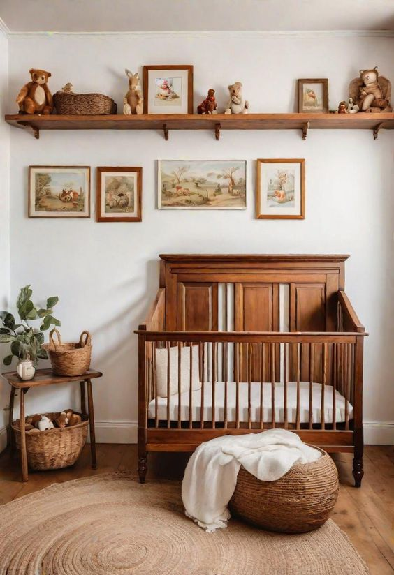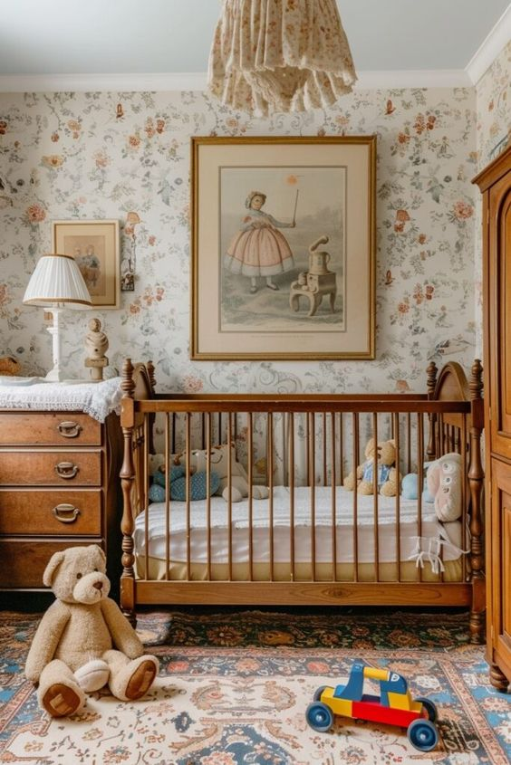 An inviting vintage nursery creates a warm and welcoming atmosphere. This theme emphasizes comfort and charm, ensuring that the nursery feels both elegant and approachable. By incorporating cozy textures, soft colors, and welcoming décor, the nursery becomes a delightful space that invites relaxation and enjoyment. This approach balances elegance with a sense of comfort, making it an ideal choice for a nurturing environment.