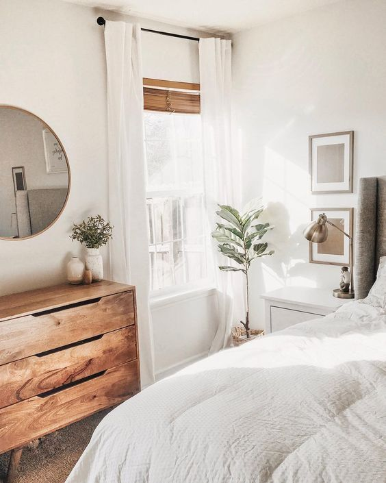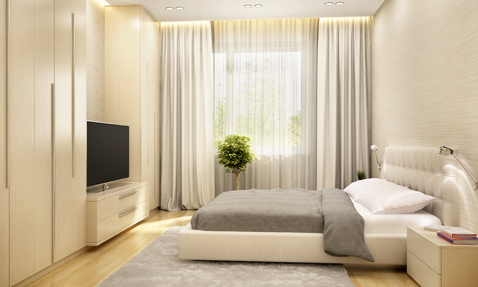 To maintain a fresh and airy ambiance, consider using floor-to-ceiling white drapes for your windows. White curtains are excellent for reflecting light and diffusing it throughout the room, creating a bright and open feel. While they can be challenging to keep clean due to dust accumulation, having a few backup sets can help you manage their maintenance easily. This choice is perfect for achieving a minimalist and modern look in your bedroom.