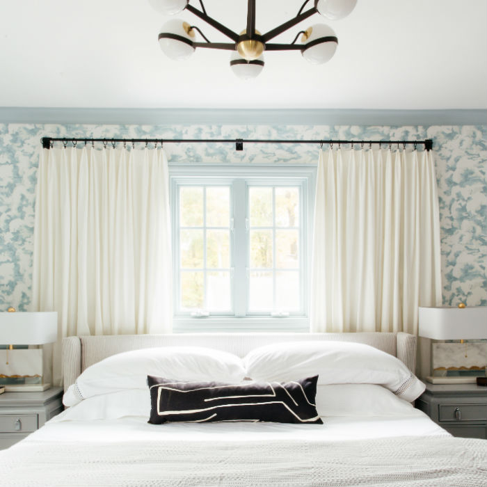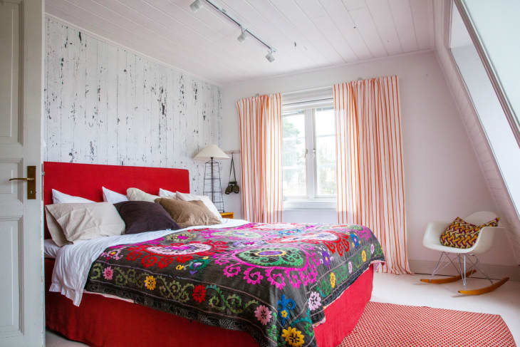 Striped or linear patterned curtains can emphasize the vertical height of your bedroom. Apartment Therapy’s semi-boho design uses a combination of white and orange stripes to add warmth and color without overwhelming the space. These curtains are ideal for adding a splash of color while keeping the overall design light and balanced.