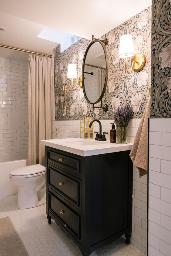 Incorporating patterns into a moody bathroom adds texture and depth, enhancing the overall aesthetic. The intricate designs bring a touch of charm and allure, creating a space that ages gracefully. The visual interest provided by the patterns makes the bathroom more engaging and uniquely personal, offering a delightful and enduring appeal.