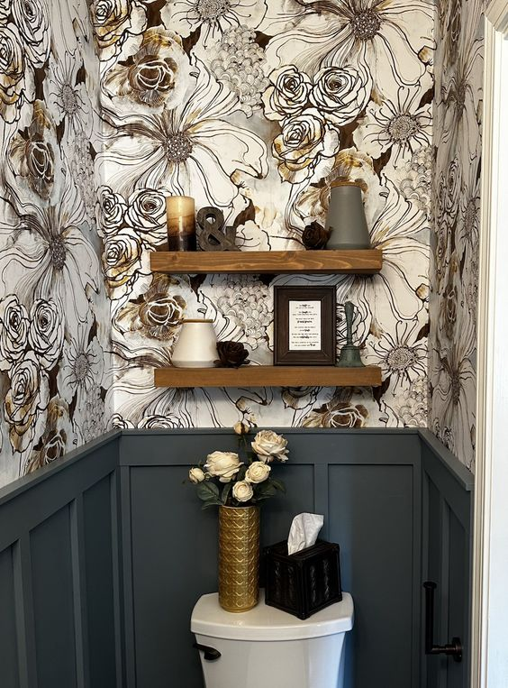 Victorian elements are perfect for achieving a vintage, moody aesthetic. The use of Victorian wallpaper, reminiscent of classic English decor, adds charm and sophistication to the bathroom. This design choice elevates the moody atmosphere, making the space feel elegant and historically rich. The result is a bathroom that exudes beauty and timeless appeal.