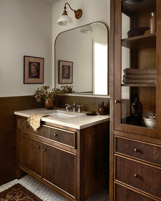 An earthy bathroom emphasizes natural tones and materials, creating a warm and inviting space. The blend of warmer hues enhances the moody ambiance, offering a vintage beauty that feels grounded and timeless. This design is perfect for those who appreciate the organic elegance and serene atmosphere that earthy elements bring to a moody bathroom.