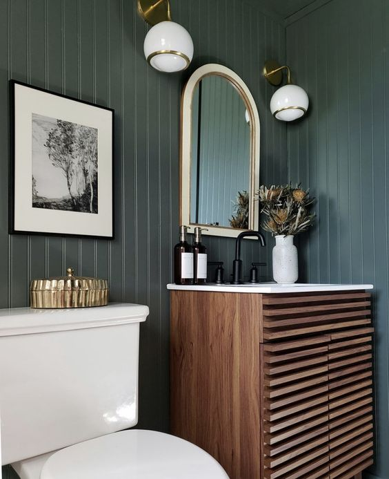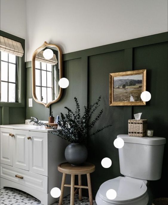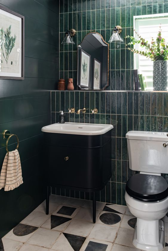 Dark green is a color that perfectly embodies a moody atmosphere. It exudes a sense of vintage opulence and sophistication. This regal hue transforms the bathroom, making it feel luxurious and elegant. The rich, deep green creates a moody yet classy environment that feels both timeless and beautiful, ensuring a stunning and immersive experience.