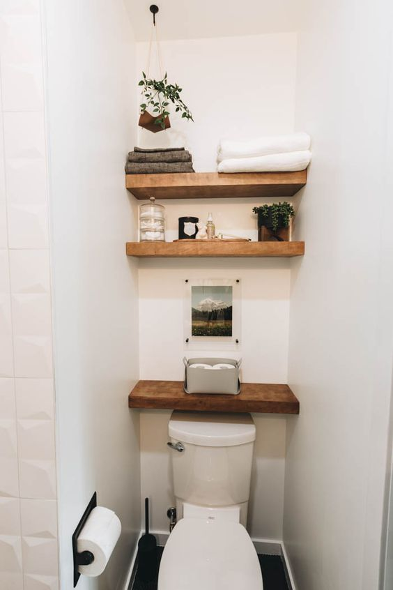 Wooden shelves are a fantastic solution for enhancing bathroom storage. They can be installed on one side of the bathroom or above the toilet, depending on your layout. These shelves are ideal for maximizing wall space and integrating seamlessly with your decor. Wooden shelves not only provide practical storage but also add a touch of warmth and style to your bathroom.