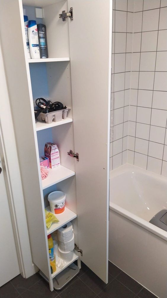 A standing cupboard offers substantial storage space and is larger than slimmer options. Known for its efficiency and ease of setup, it’s an ideal choice for those seeking a durable and practical storage solution. Standing cupboards from IKEA are particularly noted for their quality and effectiveness in bathroom settings.