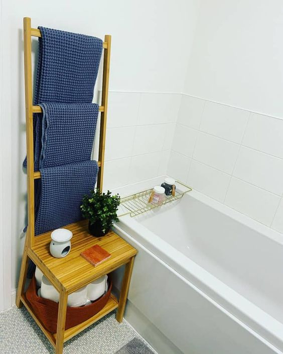 A ladder rack is an elegant solution for towel storage. Positioned against the bathroom wall, it helps reduce clutter and provides easy access to towels. Beyond towels, you can also hang other items on a ladder rack, making it a versatile and space-efficient addition to your bathroom.