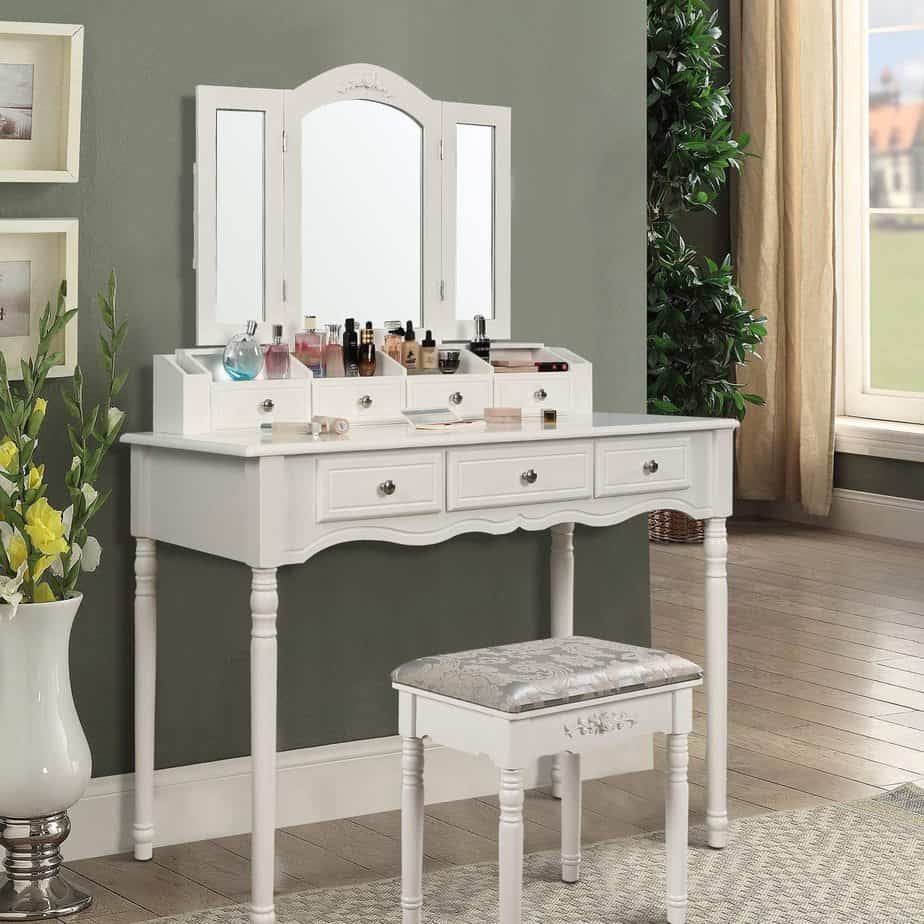 If your bathroom is cramped or shared, install a makeup vanity in your bedroom. It offers ample space for makeup and includes additional storage for jewelry, enhancing both organization and convenience.