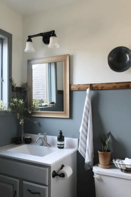 Achieve a stylish split paint effect on your bathroom walls by adding a simple piece of wood. The classic gray-and-white color scheme lends a sophisticated touch, making it a quick and effective update for your bathroom. This idea offers a fresh look without requiring extensive renovations.