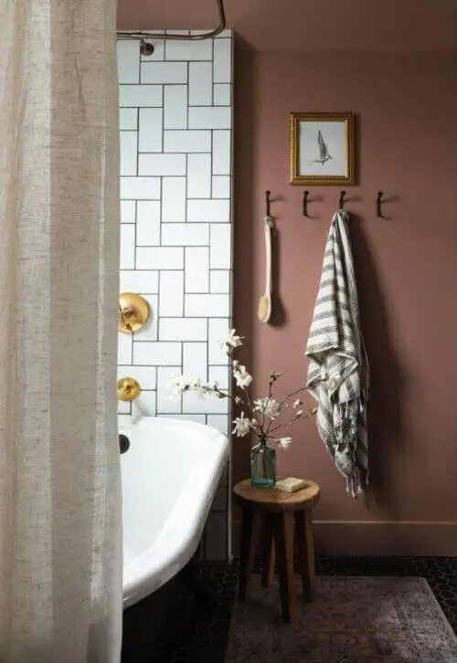Combine dusty rose with marble for a sophisticated and cozy bathroom look. Although this color scheme might not be conventional, it offers a unique aesthetic. Add copper elements, such as candle holders and mirrors, along with pink and white accessories to complete the look.