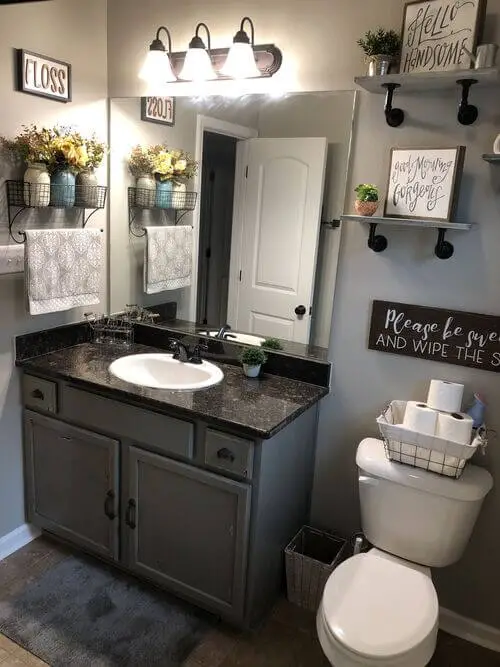 Transform your bathroom into a cozy retreat with mood lighting and floating shelves. Incorporate quotes, painted mason jars with flowers, and extra plants to enhance the farmhouse feel. This charming concept adds a personalized touch and makes any space feel more inviting.