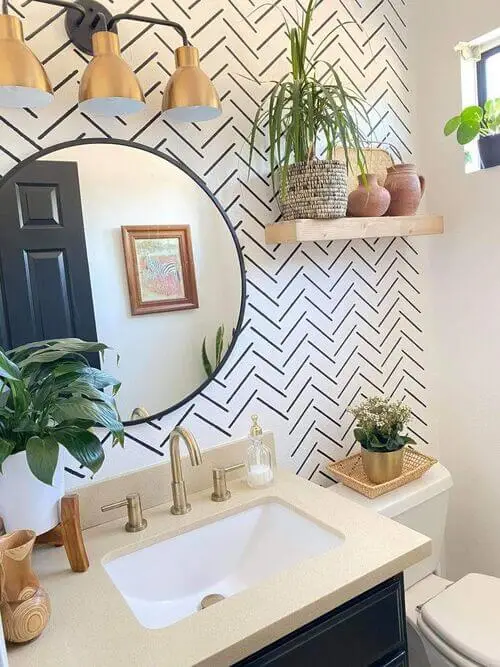Create a striking impact with a bold statement wall in your bathroom. Use easily replaceable wallpaper to bring your design vision to life. To brighten the space, incorporate mood lighting, gold accents, and light wooden shelves. Complement these elements with small accents such as woven baskets, plants, and artwork for a cohesive and inviting look.