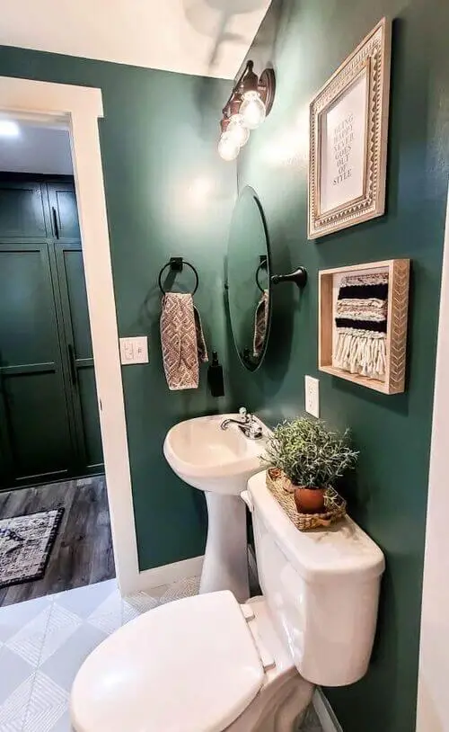 Forest green can inspire beautiful and creative bathroom designs. To soften the intensity of the green, combine it with gold and light wood elements. Ensure the space remains well-lit by updating the mirror and adding additional lighting.