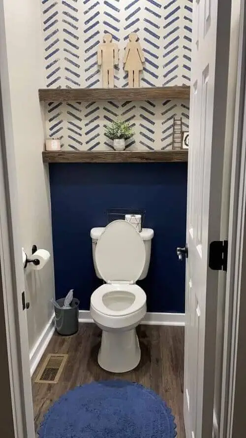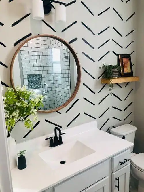 Create a dynamic visual with a paint and wallpaper split on your walls. Use floating shelves to divide the color themes, with wallpaper on the top portion and a dark color below. This approach works well for small bathrooms, as it allows you to save floor space while adding visual interest.
