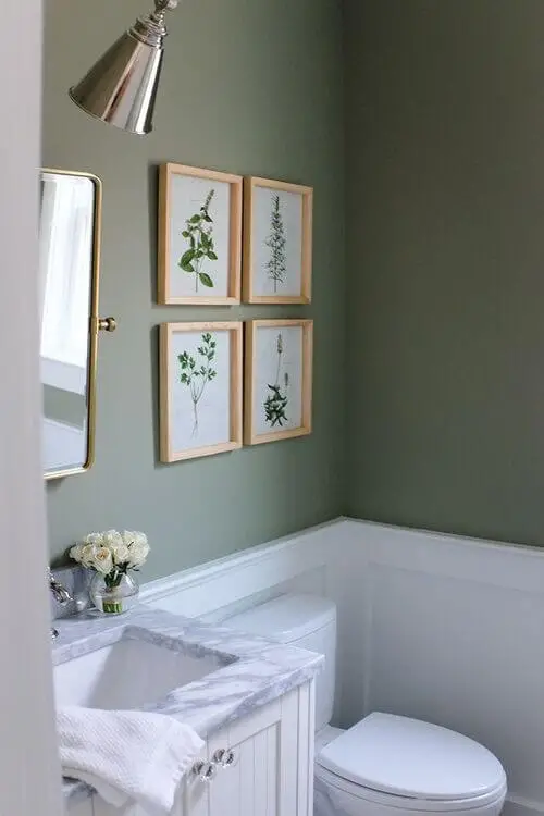 To give the impression of a larger bathroom, add wood panels to the lower portion of the walls. Paint the walls sage green and incorporate golden accents, such as on mirrors or light wood frames for wall art. This combination creates a bold and stylish look.