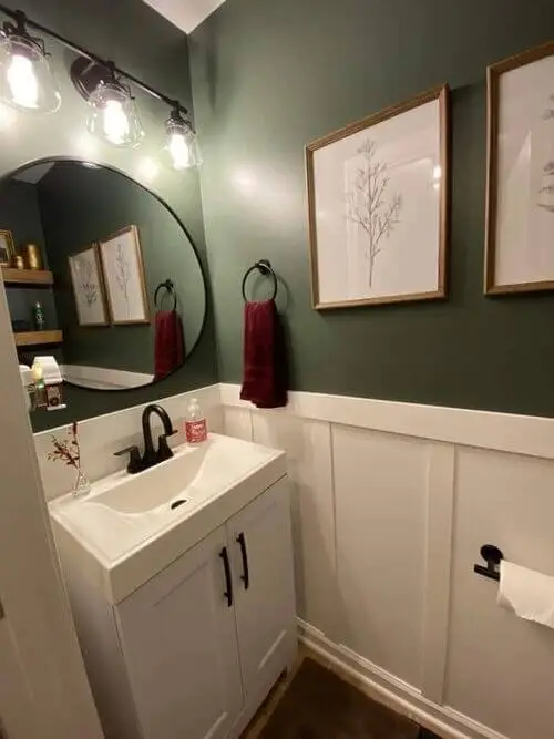 Incorporate dark green and wood paneling for a sophisticated bathroom design. Add golden artwork and Edison bulbs to brighten the space. Additional lighting ensures the bathroom remains well-illuminated, complementing the deep green tones.