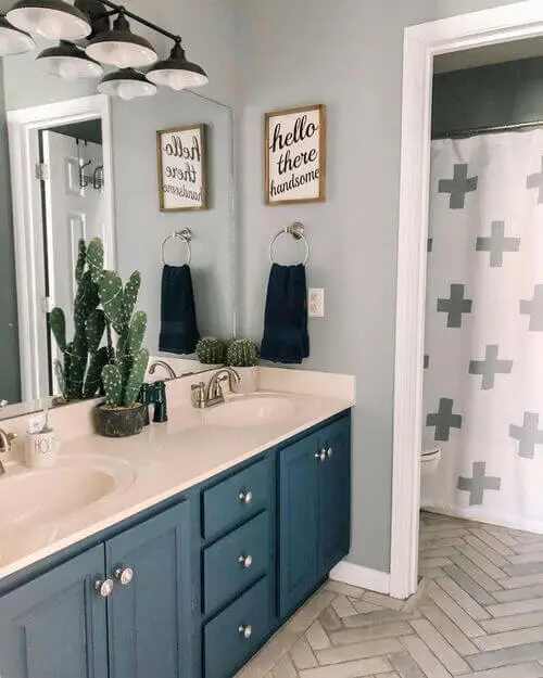 Create a serene and comfortable bathroom environment using various shades of blue. This color palette brings a spa-like tranquility to your home. For added interest, include succulents and cacti, and consider using gold accents to introduce a bold contrast.