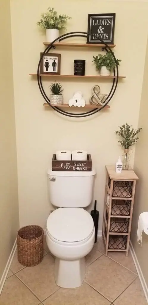 For a rustic touch, use woven baskets, wooden shelves, and storage solutions. Combine these with greenery and small plants that thrive in the bathroom. This combination creates a warm and inviting atmosphere, perfect for a cozy bathroom setting.