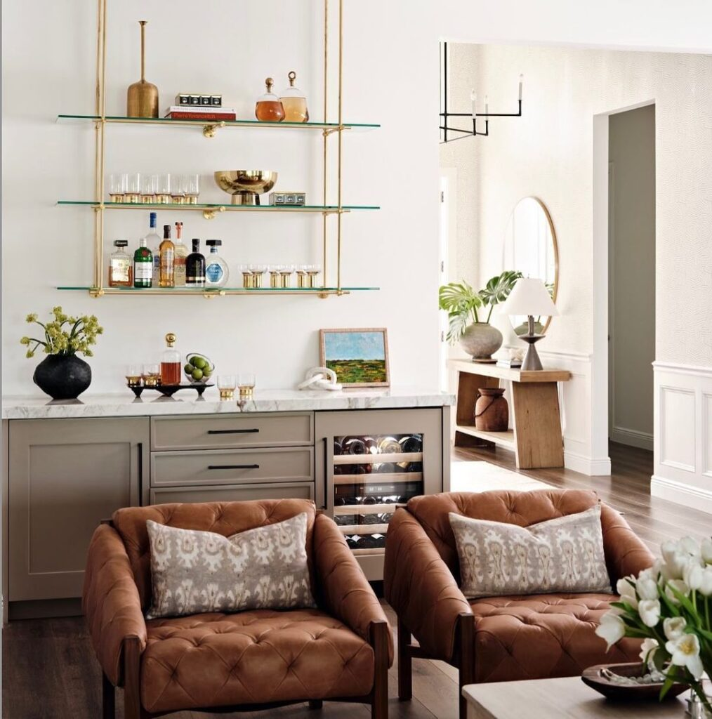 Kicking off our roundup, this lounge room bar exudes sleek sophistication. Brass accents and glass shelving display a curated selection of spirits, creating a welcoming corner for enthusiasts. Smooth marble counters add to the luxurious ambiance, while plush seating invites guests to unwind and savor their drinks.