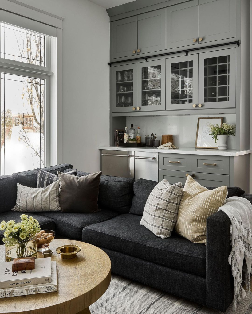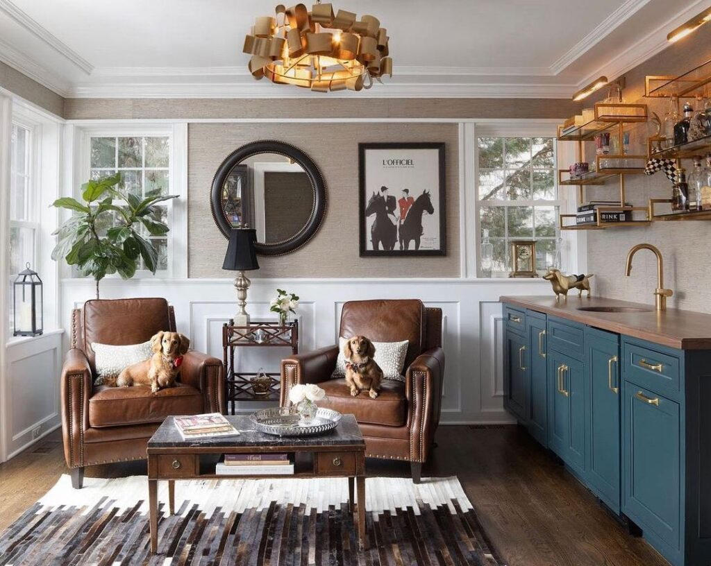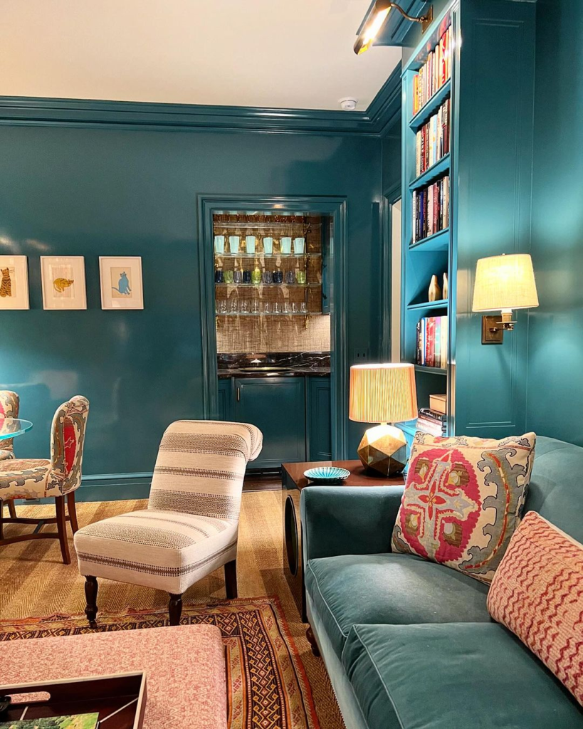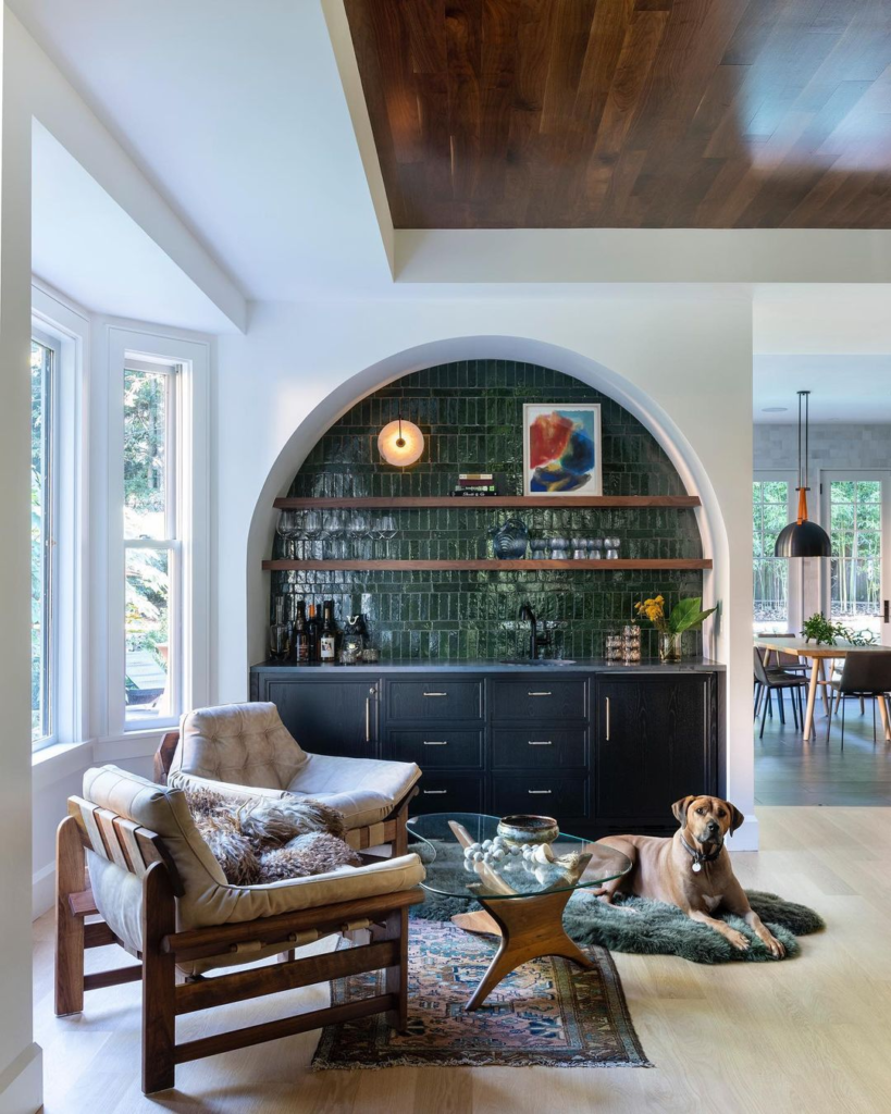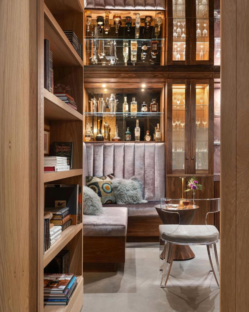 Book lovers will adore this teal-tinted bar alcove. Flanked by bookshelves, it’s a sanctuary for both literature and liqueur. A plush sofa and patterned accents invite lengthy relaxation, creating a personal library with a twist.