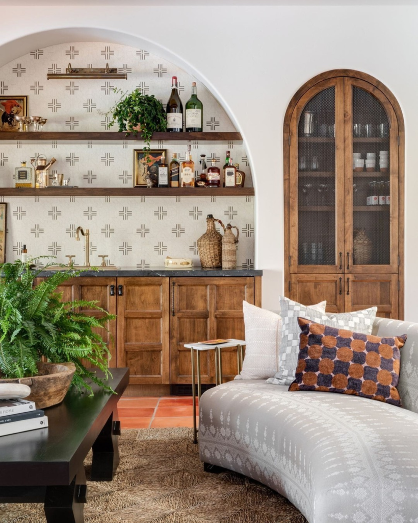 Echoing the warmth of Mediterranean interiors, this bar area features soft curves and textured walls. A mix of open shelving and hidden storage balances functionality with aesthetic charm. A patterned backsplash acts as a centerpiece, ensuring every cocktail hour feels like a getaway.