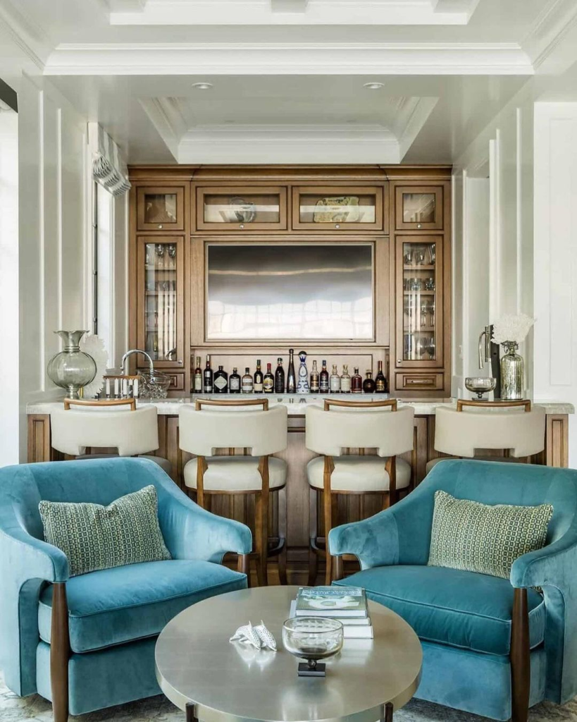 This bar evokes a seaside haven with its lighter ambiance. Azure seats pop against neutral wood, and a round marble table centers the space. Soft lighting and ample storage complete the look, crafting a serene spot for sea-inspired sips.