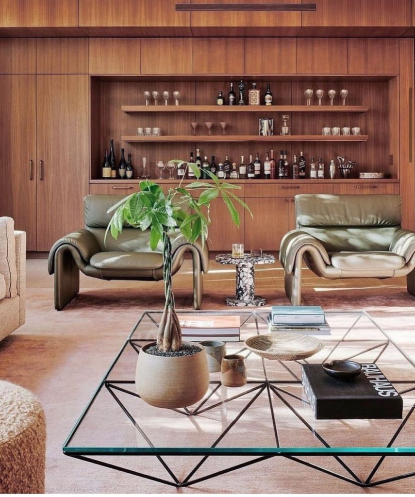 This lounge room celebrates mid-century modern design. Sleek wooden lines define the space, hosting a symphony of bottled delights. Lush leather chairs echo the era’s charm, set against a geometric coffee table that anchors the room.