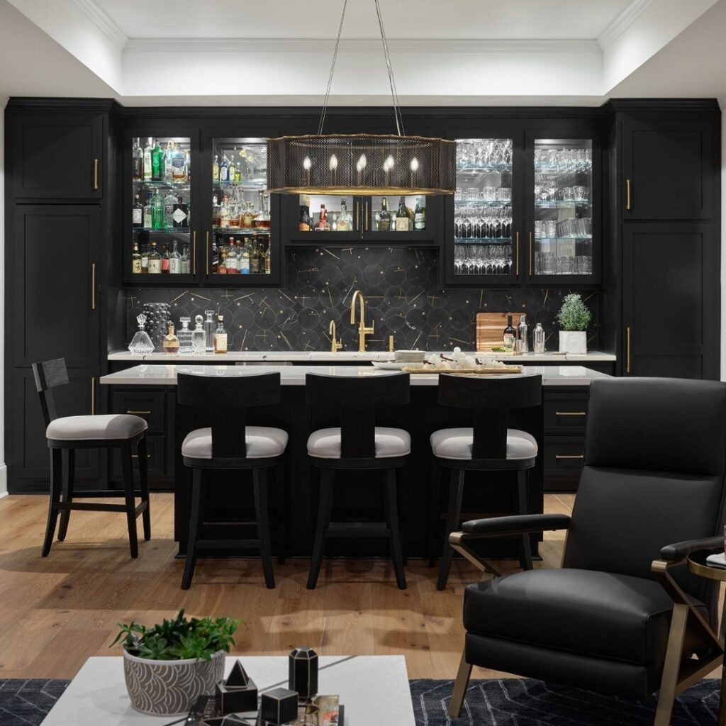 Monochrome gets a luxurious upgrade in this bold lounge. Black surfaces and gold fixtures create a sophisticated bar area. Stools circle around, ready for evening tales under the refined light of a classic pendant.