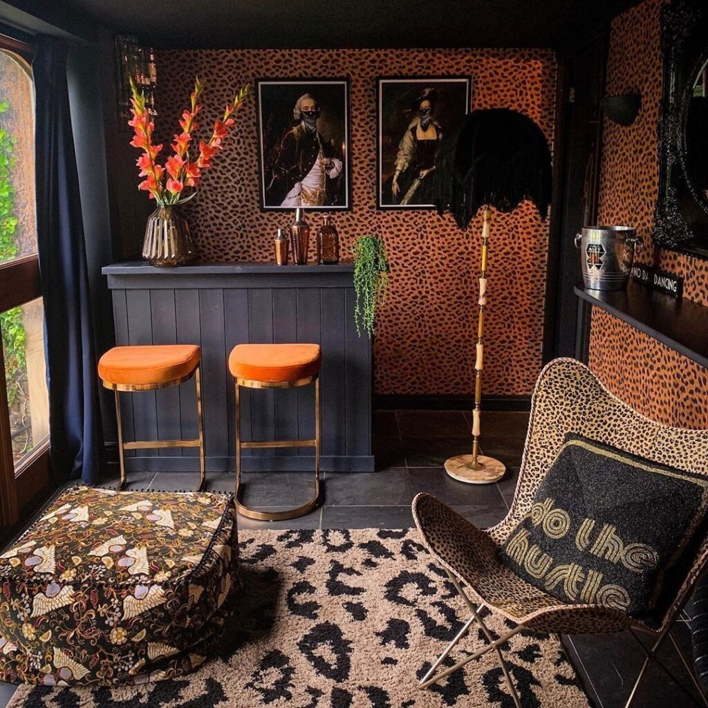 Step into the wild with this daringly decorated home bar. Leopard prints and eclectic art set a lively tone. Plush stools and a velvety ottoman offer a perch for sipping cocktails in a room that roars with personality.