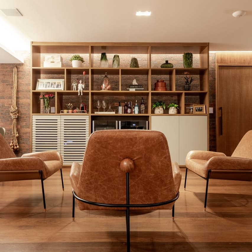 This urban-styled lounge marries industrial elements with inviting comfort. Exposed brick walls juxtapose with neat wooden shelving, while leather loungers echo the warmth of cognac, creating a space of laid-back luxury.