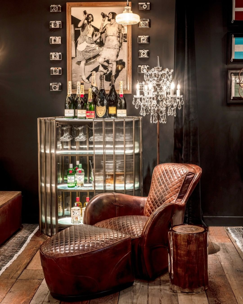 Step back into the roaring twenties with this modern-day speakeasy. A chandelier casts a grand glow over the bar, where champagne awaits. Leather recliners nod to classic decadence, creating a space Gatsby himself would envy.
