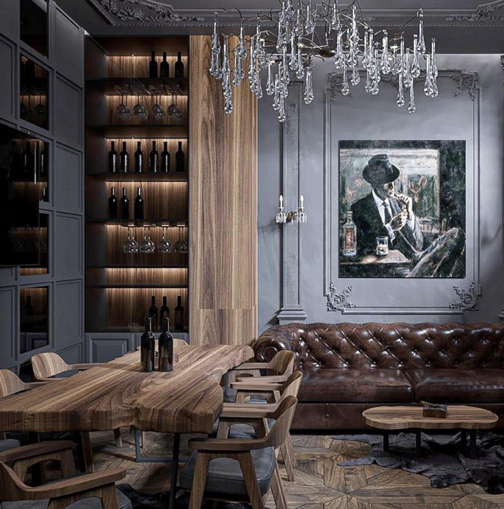This home lounge bar whispers of elegance and history. Rich wooden textures and deep leather chairs suggest timeless dignity. A grand chandelier and classic art accentuate its noble character, offering a space where every sip feels like a story from a bygone era.