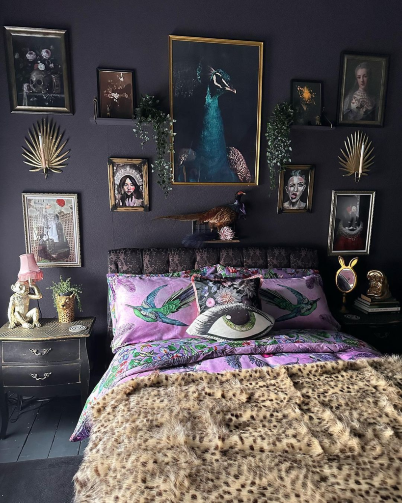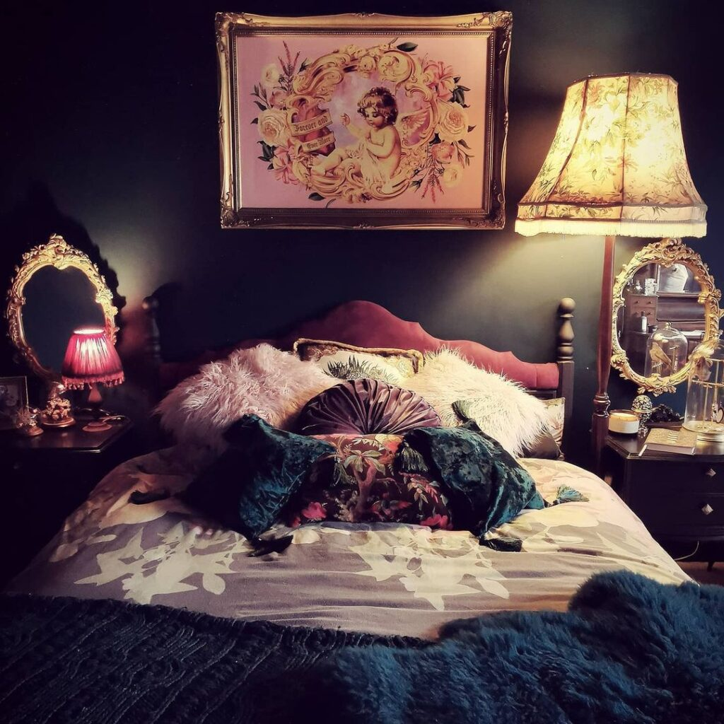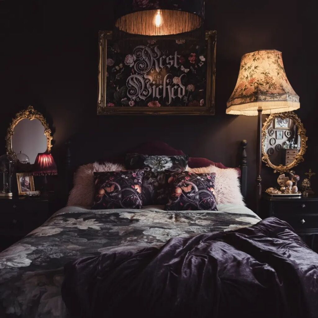 Bathed in rich, dark tones, this bedroom blends vintage charm with a mysterious allure. Velvet fabrics and fur throws invite tactile delight, while the soft glow from ornate lamps gentles the dark, sensuous walls.