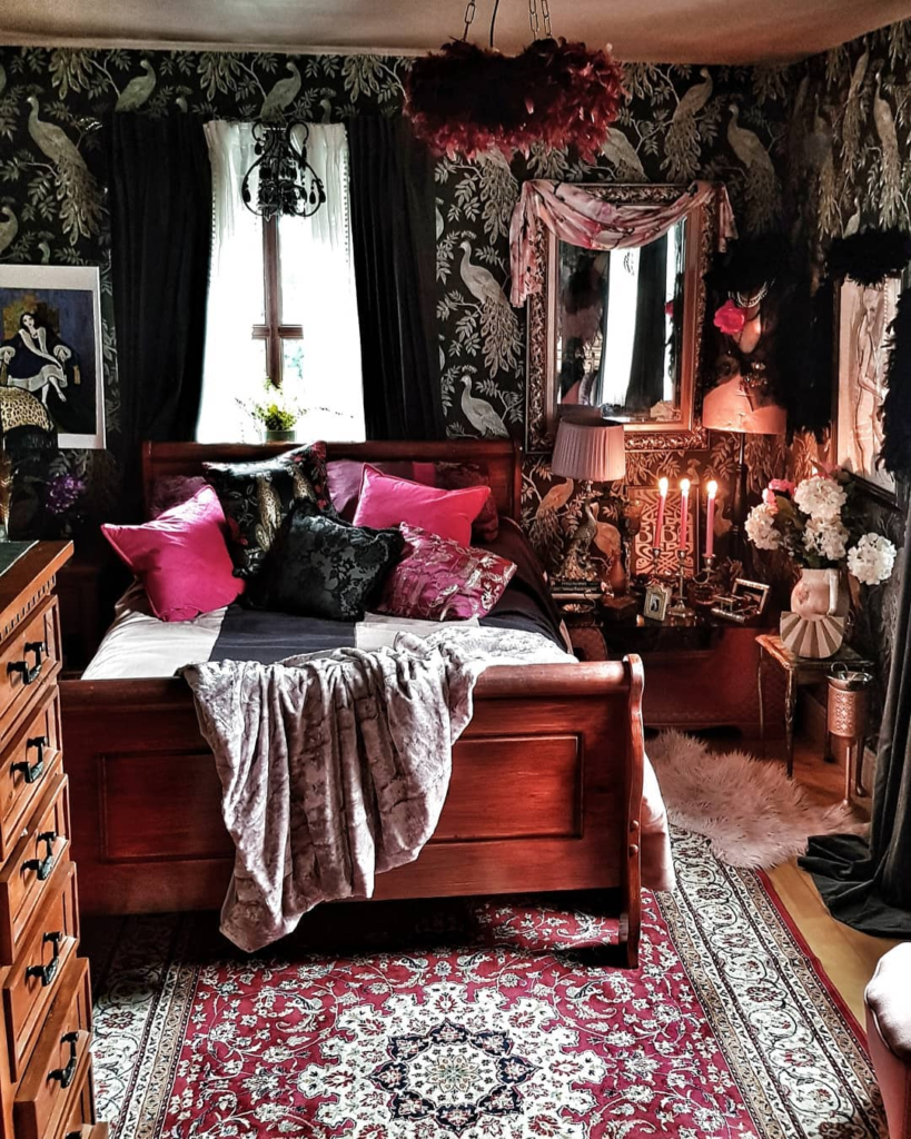 Rich in patterns and cultural depth, this bedroom transports you to a realm of dark fairy tales. It feels as though the room itself could unfold countless bedtime stories, whispered in the quiet of the night.