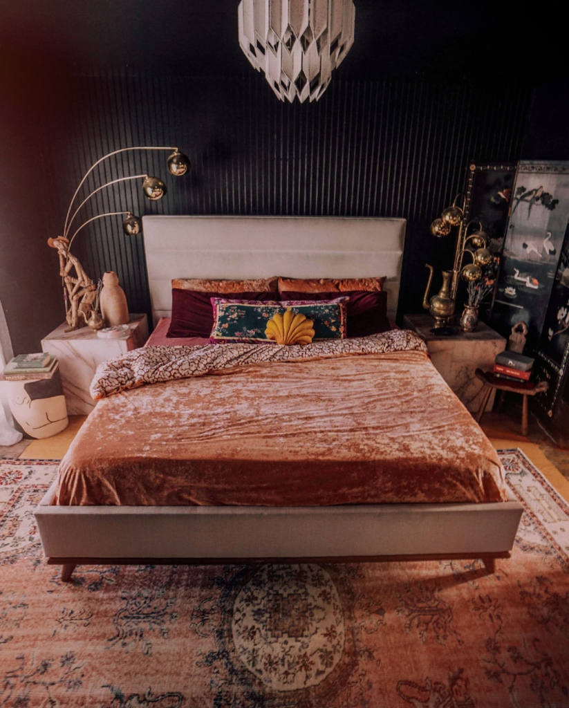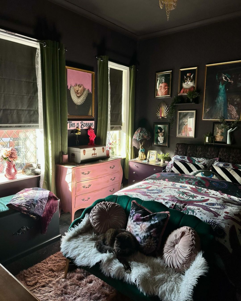 This bedroom is a bohemian luxury haven, where each piece has its story. The eclectic style and dark, inviting colors create a cozy enclave for the creative soul.