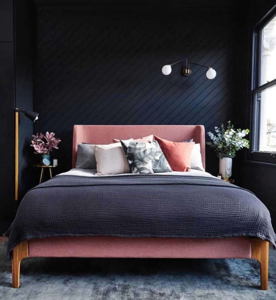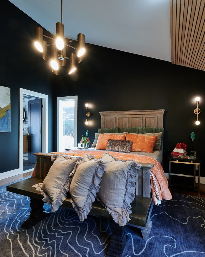 Bold and modern, this bedroom uses dark walls to accentuate woodsy tones and vivid blue patterns. The combination of sleek, contemporary lighting and warm, rustic textures creates a space that is both stylish and cozy.