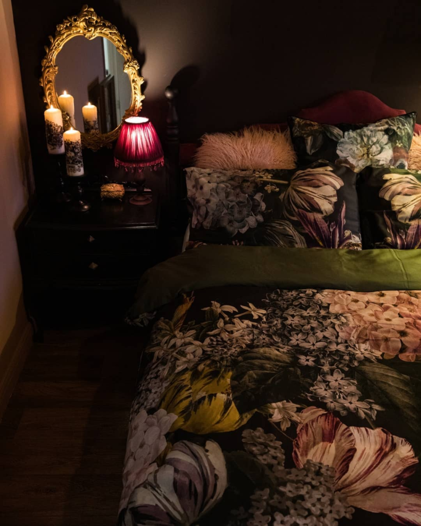 In this bedroom, candles and a richly hued lamp cast a mystical glow, highlighting intricate floral patterns across the bedding. The dark palette serves as a backdrop for a gold-framed mirror and deep green accents, weaving a tale of romantic evenings.