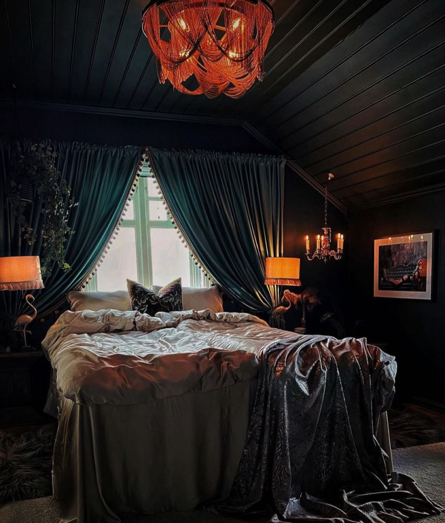 Draped in luxury, this room features lush velvet curtains and satin sheets, illuminated by a striking orange chandelier. Plush textures and rich hues combine to create a bedroom of dark sophistication and sumptuous comfort.