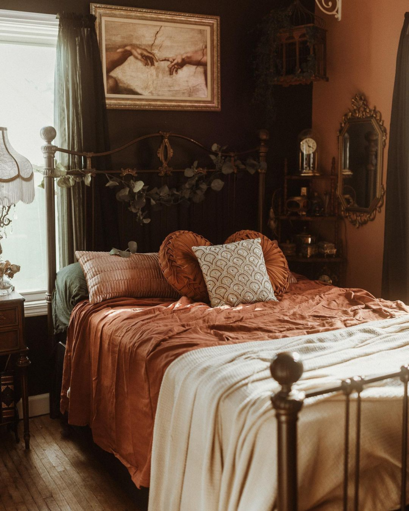 Dark chocolate walls frame a four-poster bed draped in burnt orange and cream, with an iconic image of reaching hands above. Eucalyptus garlands add nature’s touch, creating a blend of old-world charm and contemporary dark femininity, revealing history and elegance in every corner.