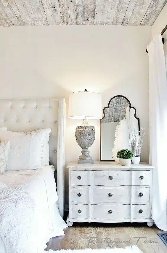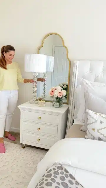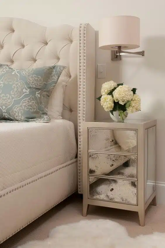 Enhance your nightstand with a mirror for both functionality and charm. An arched mirror leaning against the wall or a small mirror on the nightstand itself adds a touch of elegance while serving practical purposes, like quick touch-ups before bed.