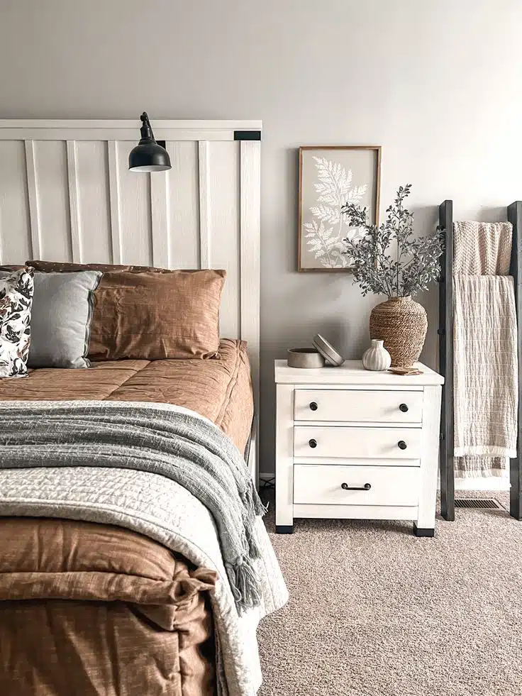 Combine natural wood elements with greenery to create a warm, rustic look. A chunky wooden nightstand paired with a vase of fresh plants brings a cozy, earthy feel to your bedroom. This combination creates a comforting and inviting atmosphere.