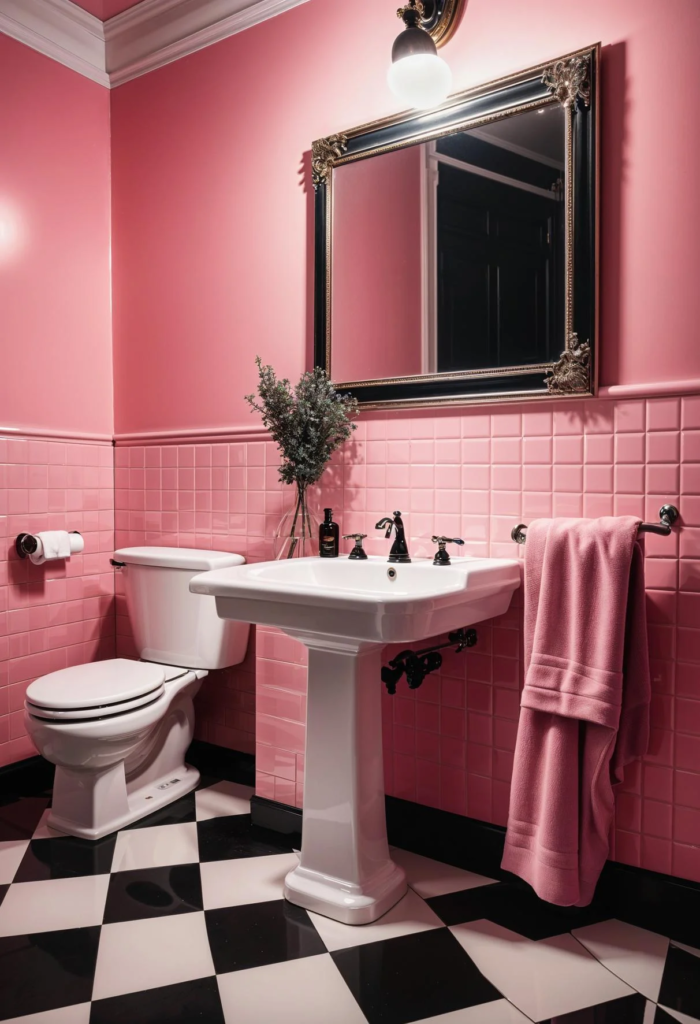 Embrace a touch of nostalgia with a vintage pink bathroom that seamlessly blends retro allure with modern elegance. Imagine stepping into a space where the classic charm of the ’50s meets contemporary style, creating a delightful contrast. The vibrant pink walls bathed in morning light provide an energizing start to your day, while the checkerboard floor adds a playful element that keeps the design lively and engaging. This isn’t just a bathroom; it’s a refreshing retreat that brings both sophistication and cheerfulness to your daily routine.