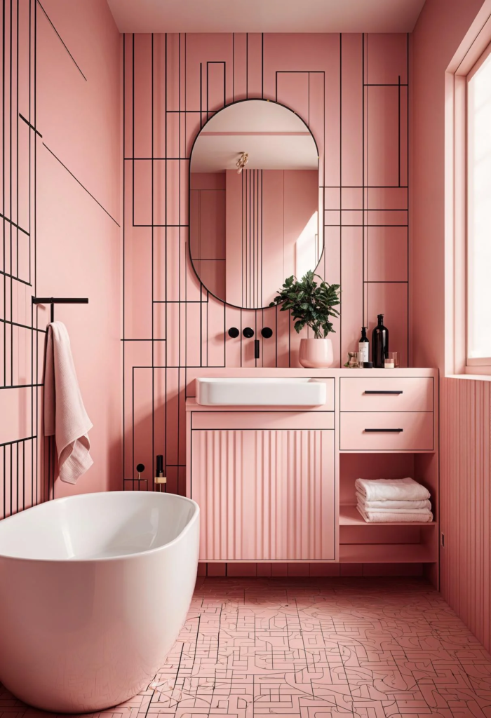 Refresh your bathroom with geometric pink patterns that blend calm and chic. Incorporate pink tiles in diamond or hexagon shapes for a stylish and soothing look. This design approach adds a touch of sophistication and modern flair, making your bathroom both eye-catching and tranquil. The geometric patterns create a dynamic visual interest, transforming your space into a uniquely elegant retreat.