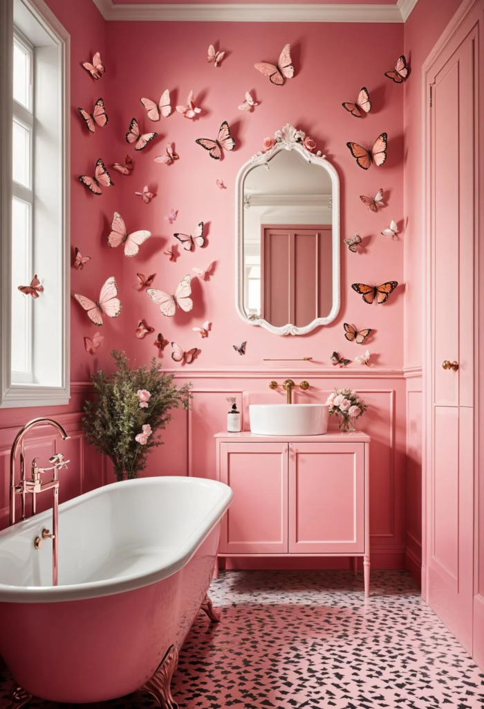 Infuse your pink bathroom with whimsy and charm using butterfly wall decals. This playful design adds a touch of magic, transforming your space into a delightful retreat. The soft pink backdrop paired with delicate butterflies creates an enchanting atmosphere that brings joy and creativity into your daily routine. Butterfly decals are more than just decor; they turn your bathroom into a vibrant, ever-evolving work of art.
