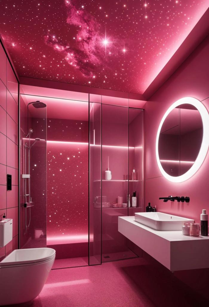 Elevate your bathroom experience with a pink ceiling that mimics a starry night. The gentle glow of the ceiling creates a serene and magical atmosphere, making every bath feel like a dip under the stars. This enchanting addition adds warmth and whimsy, turning your bathroom into a luxurious retreat. The starry ceiling is more than a design choice; it’s an experience that adds a touch of celestial comfort to your daily routine.