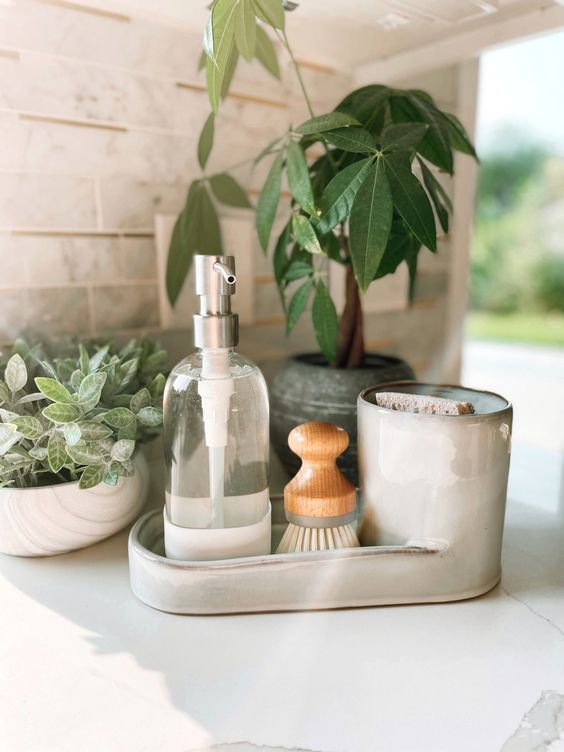 A soap caddy is a practical addition to your kitchen for organizing cleaning supplies. It keeps dish soap and sponges neatly arranged, preventing clutter on the countertop and making dishwashing more efficient.